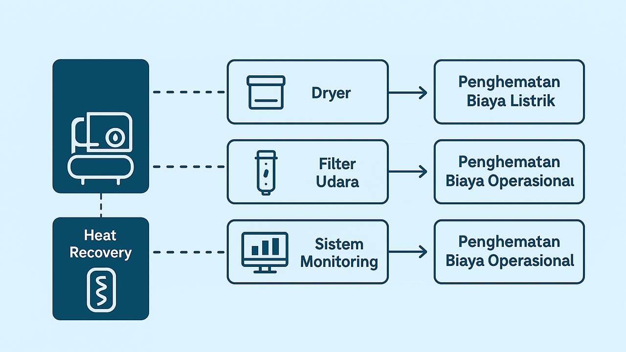 Karena itu, meningkatkan efisiensi energi pada sistem kompresor udara bukan hanya soal penghematan biaya, tapi juga langkah strategis menuju operasional industri yang lebih berkelanjutan dan ramah lingkungan.